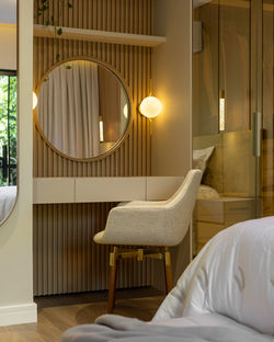 Estando mais reservado do restante da residência e no pavimento superior, encontram-se projetados os ambientes mais íntimos: quartos e suíte do casal, este último com pedido de integrar a área de banho – proposição da banheira de imersão com vista para a mata ao lado do terreno –, com o restante da suíte. Nestes espaços e na residência como um todo, a palavra-chave em termos de interiores pode ser definida como aconchegante, elegante e intimista, com a presença de materiais naturais, a qual se faz presente na identidade do estúdio e como solicitação do casal ao idealizar os espaços.